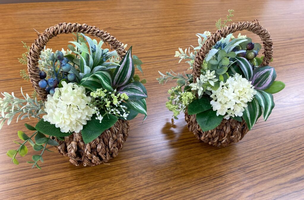 7/18(木) 葉物と白い花を合わせたバスケットアレンジのワークショップ、2名様にご受講いただきました。